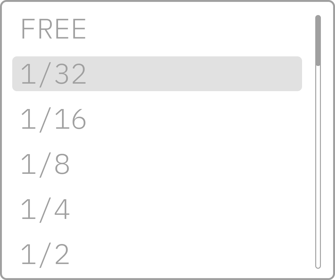 S-4の一部のパラメーターには複数のモードがあります。これらのパラメーターモードは、ピッチやスピード関連のパラメーターのスケールを選択したり、時間ベースのコントロールの時間区分を設定したり、特定のデバイスの動作を調整したりするために使用できます。