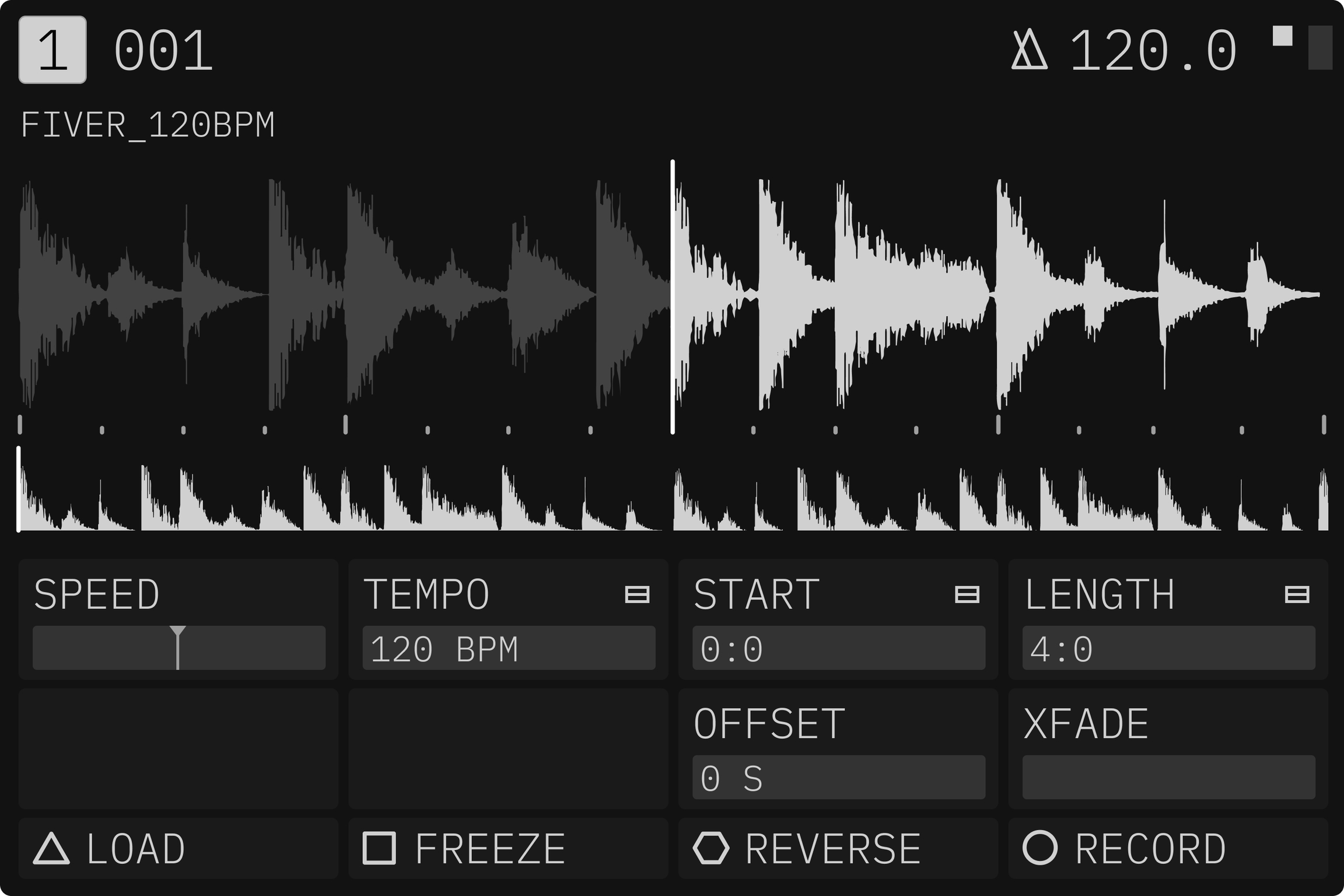 LOOP 再生時のループ動作を切り替えます。LOOPが有効(デフォルト)の場合、LENGTHパラメーターが元のサンプルの長さを超えると、ロードされたオーディオが繰り返し再生されます。LOOPが無効で、LENGTHがサンプルの長さを超えると、超過部分は無音として再生されます。