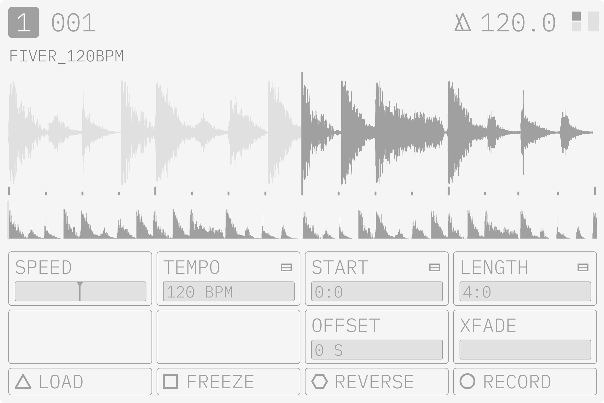 このモードでは、サンプルの再生はグローバルテンポから完全に切り離され、自由に行われます。SPEEDはスケール(パラメーターモード経由)で調整でき、サンプルのピッチと速度の両方に影響します。