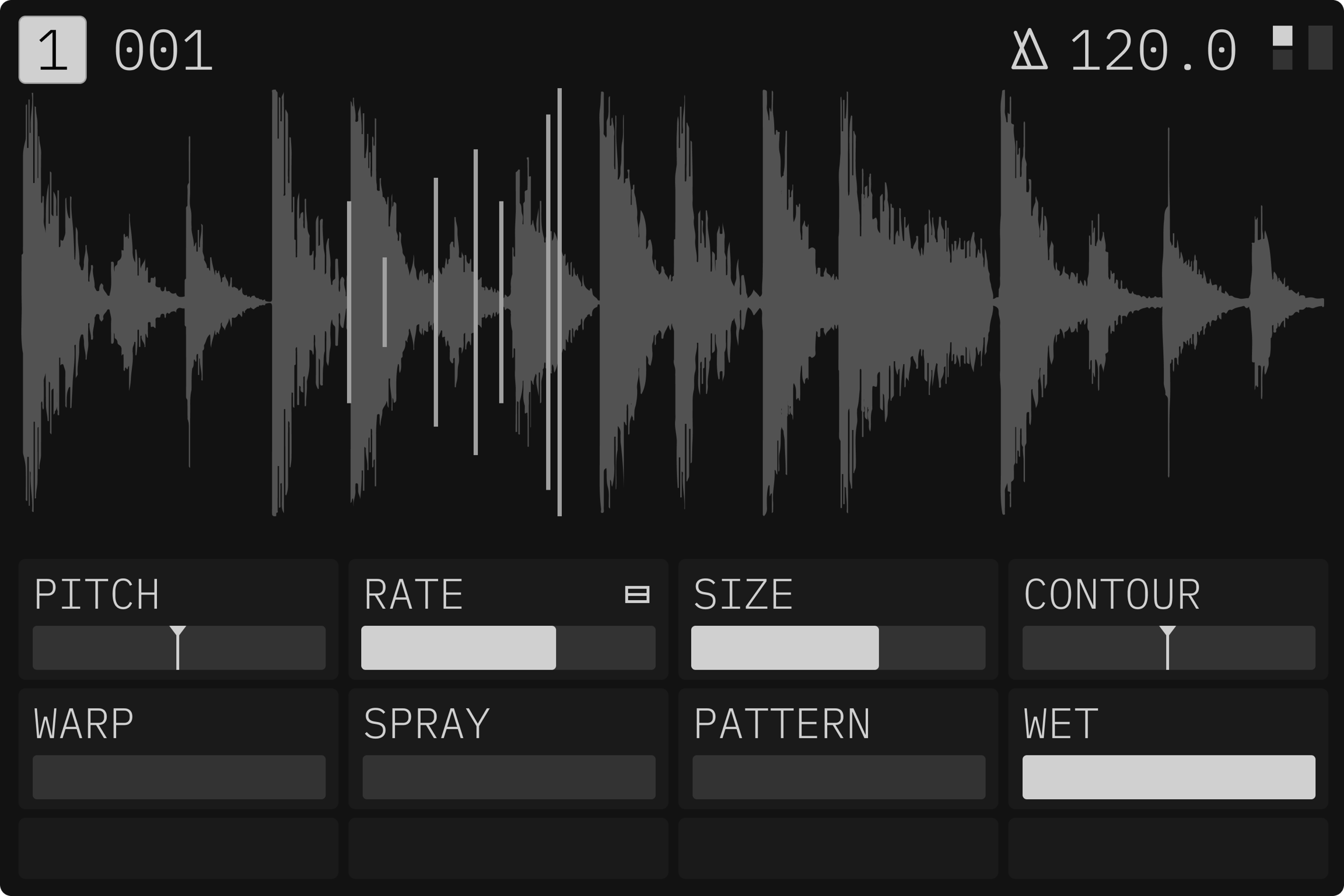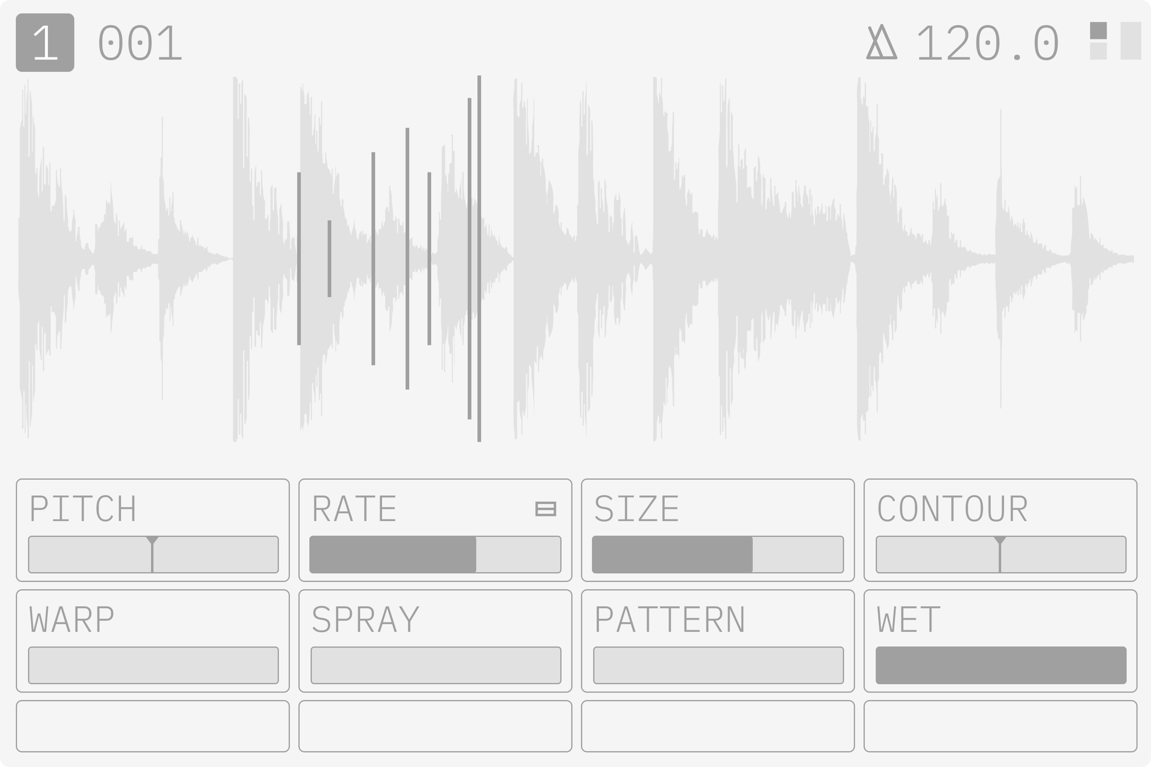 SIZE 個々のグレインのサイズを調整します。このパラメーターは、グローバルテンポに関連した拍単位で制御されます。