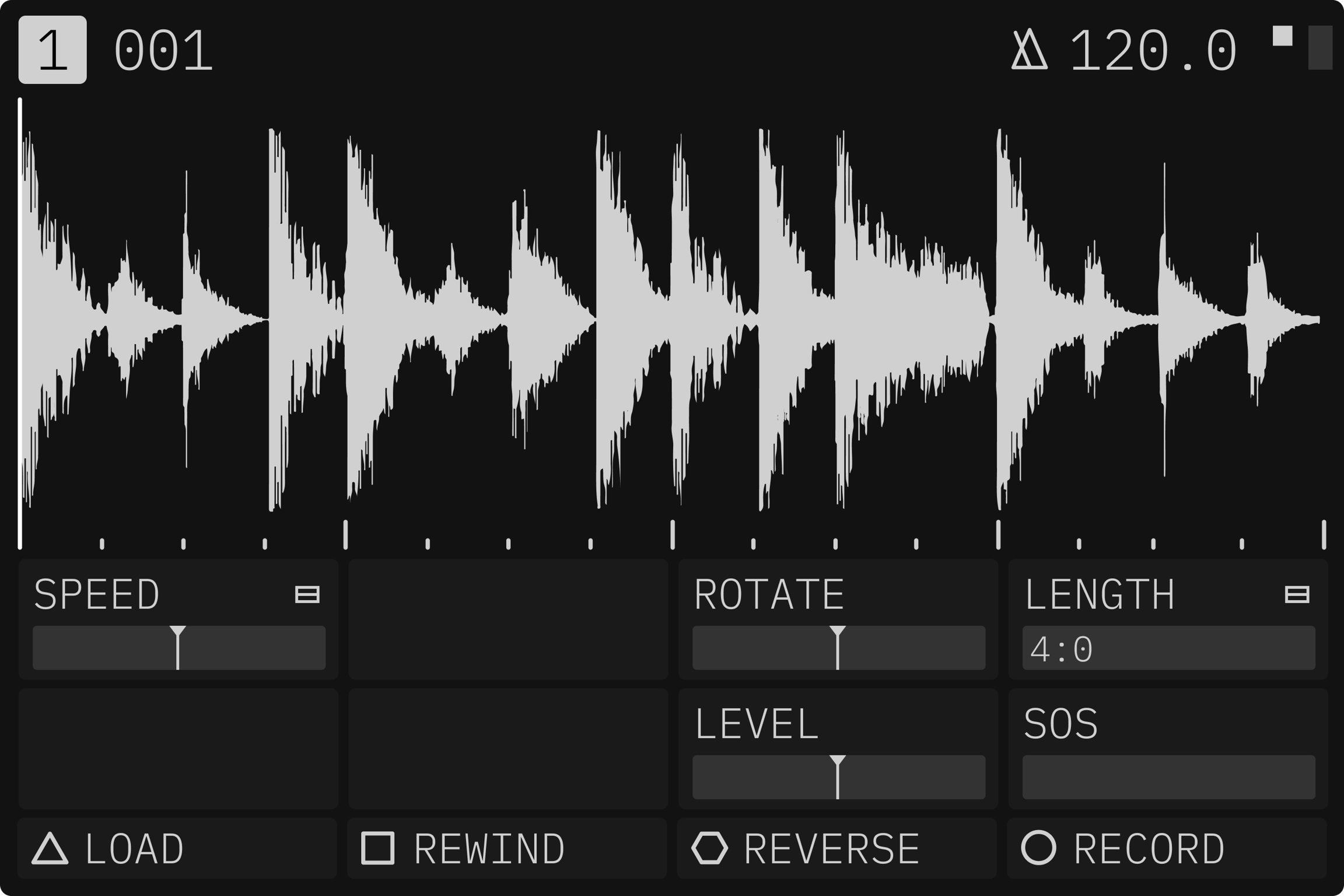 TAPEでは、専用の30秒バッファに録音する複数の方法が用意されています。バッファが空の場合、TAPEアイコンが表示され、波形が表示されず、録音が開始されます。
