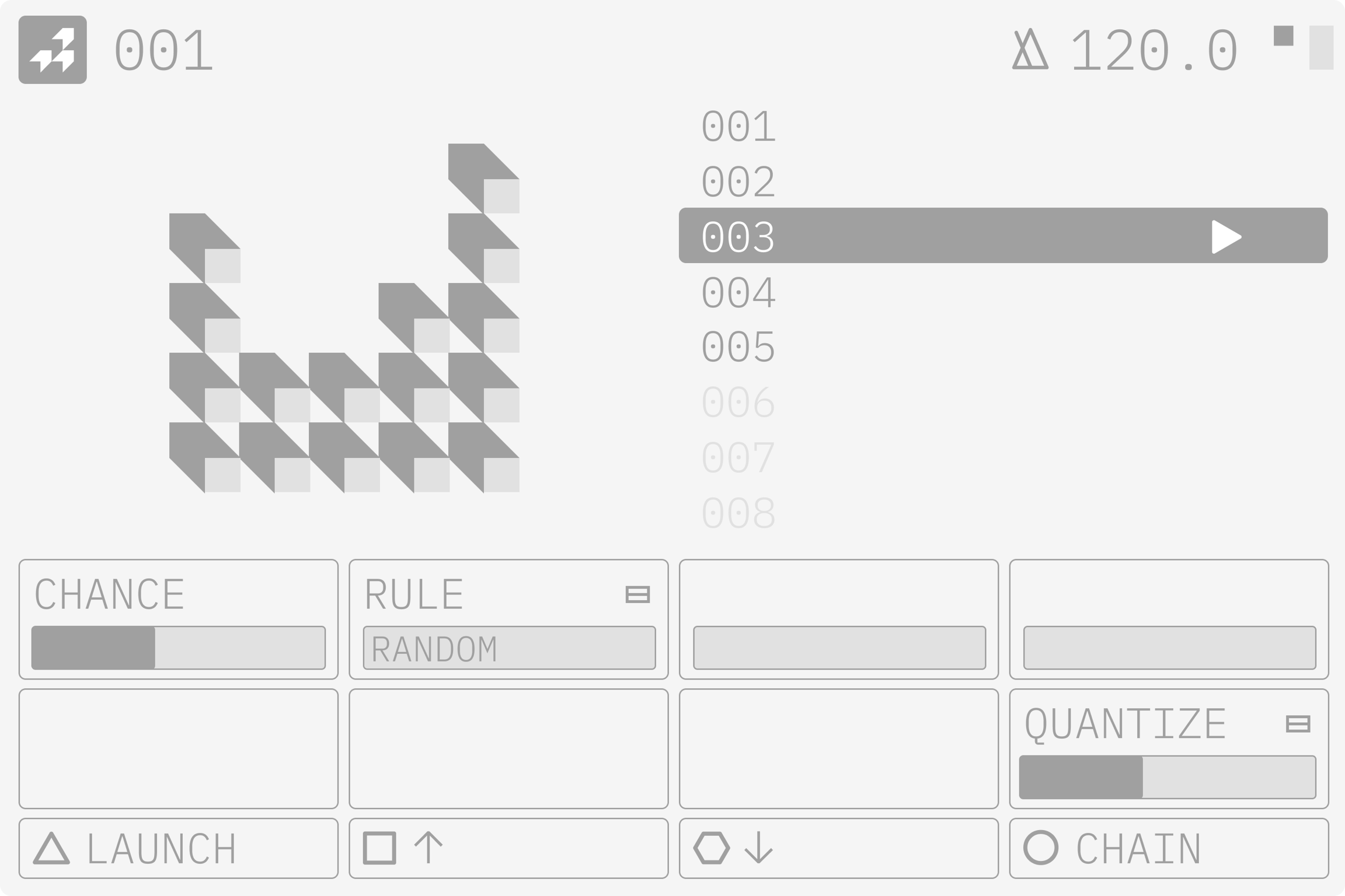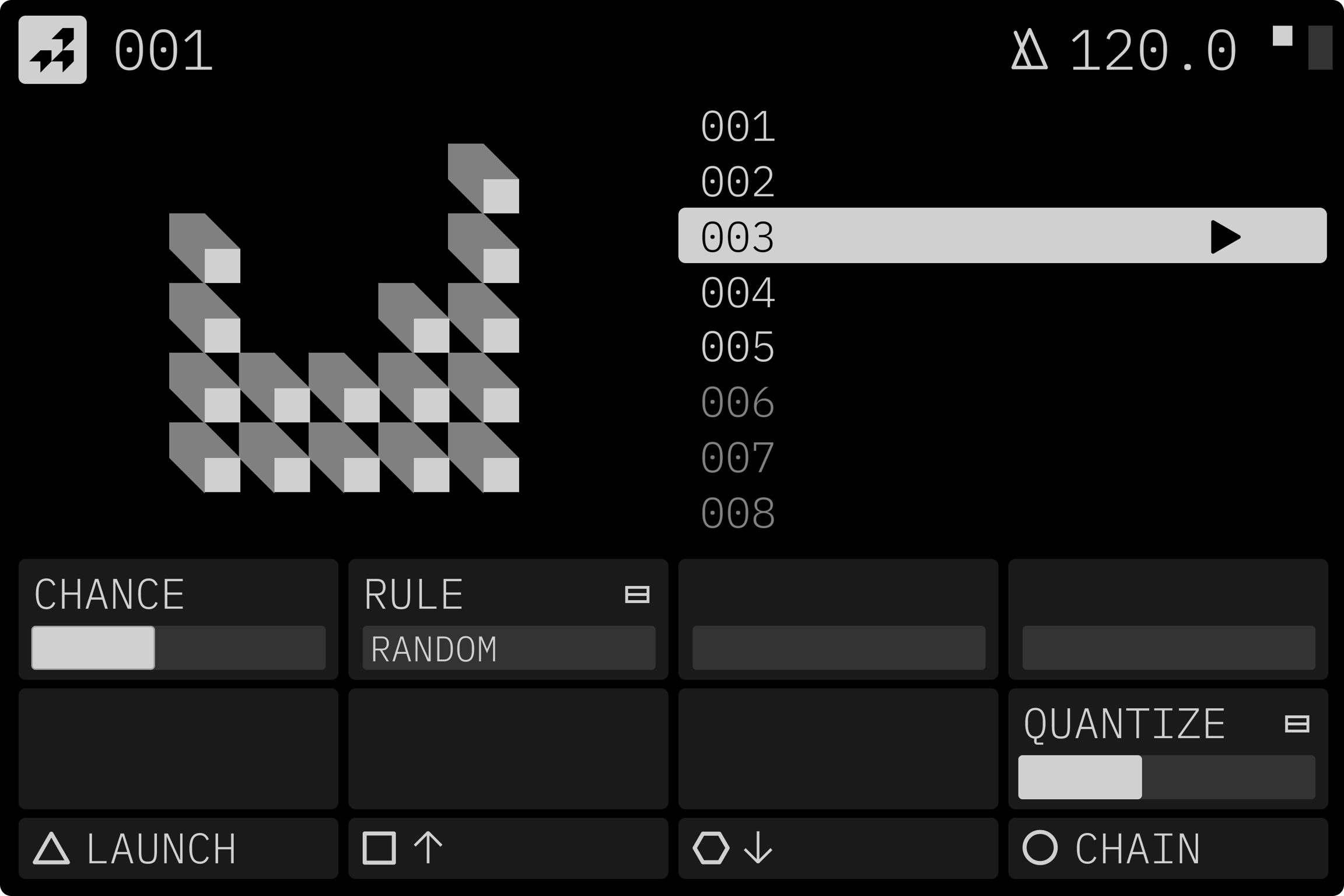 SCENE 機能では、最大128個のユニークなシーンを作成できます。 各シーンには、すべてのパラメーター設定およびサンプルの構成が保存されており、シームレスに呼び出すことが可能です。これにより、わずかな音色の変化から、ライブセット内でまったく異なる展開への切り替えまで、幅広く対応できます。シーンごとに、どのトラックのパラメーターやサンプルを反映させるかを個別に設定できるため、より柔軟かつ高度なパフォーマンスコントロールが可能です。さらに、CHANCE や RULE といったツールを使用すれば、シーンの自動切り替えも設定できます。 CHAIN や LOCK 機能と組み合わせることで、即興的でダイナミックな演奏表現を実現できます。