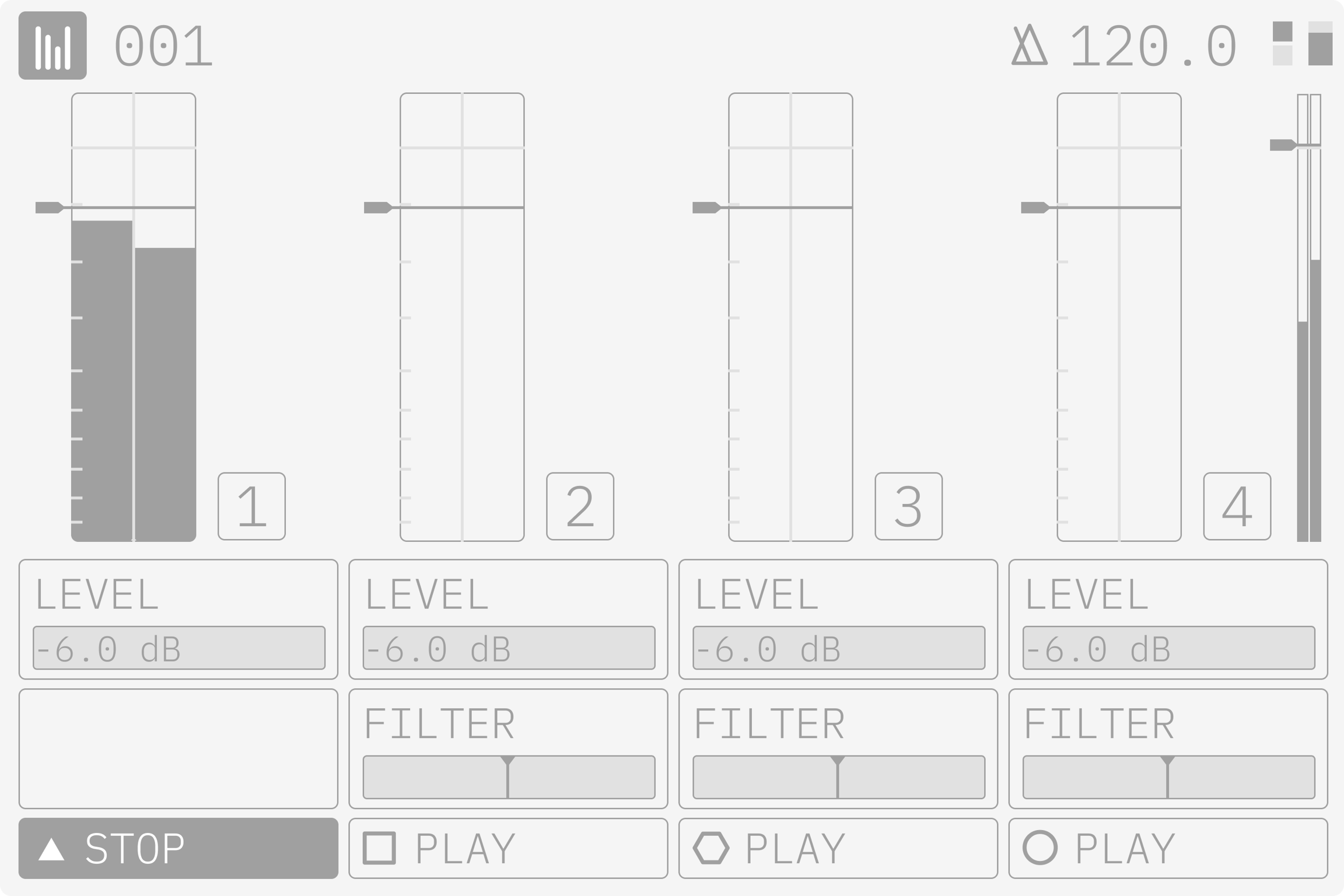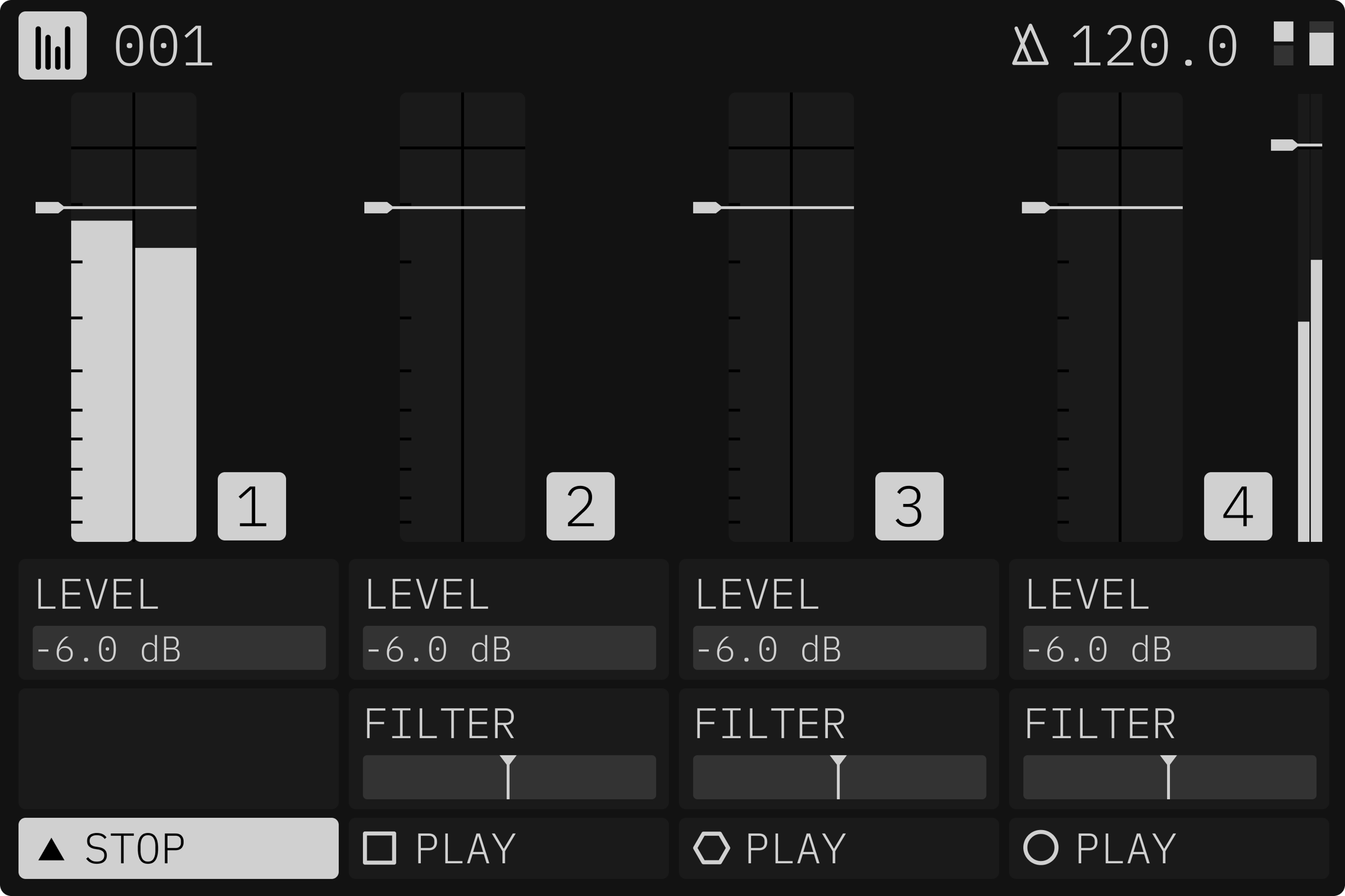 S-4の4つのトラックはすべて、プロジェクトの最終オーディオ段階で統合されます。ミックスビューでは、トラックごとにボリューム、パン、フィルタリングを調整できます。また、ミックスビューでは、個々のトラックのローンチとミュート、そしてS-4の最終出力へのコンプレッションの適用も可能です。