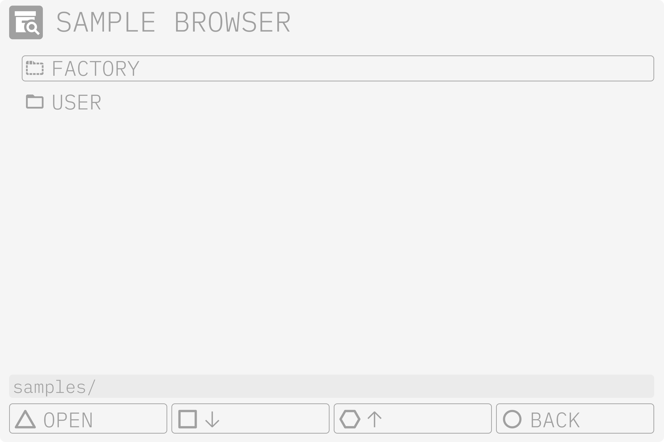フォルダー内のサンプルをすばやく聴くには、[CTRL] キーと [PLAY] キーを押しながら SELECT エンコーダーまたは UP および DOWN [ACTION] ボタンを使用してリストを移動し、プレビューします。