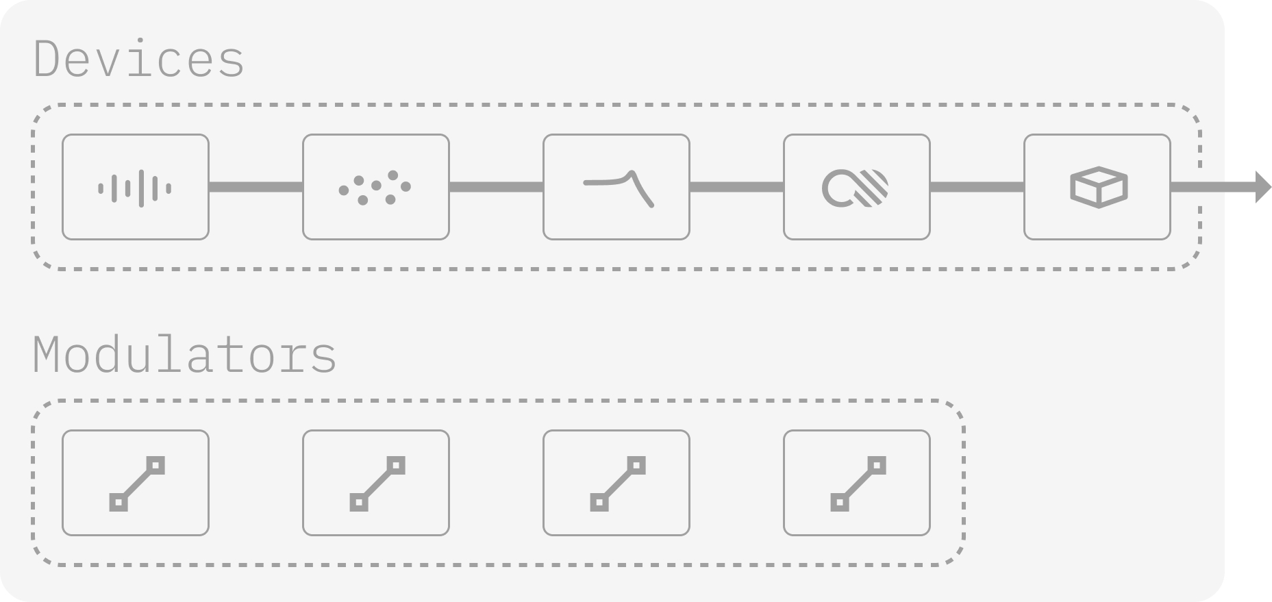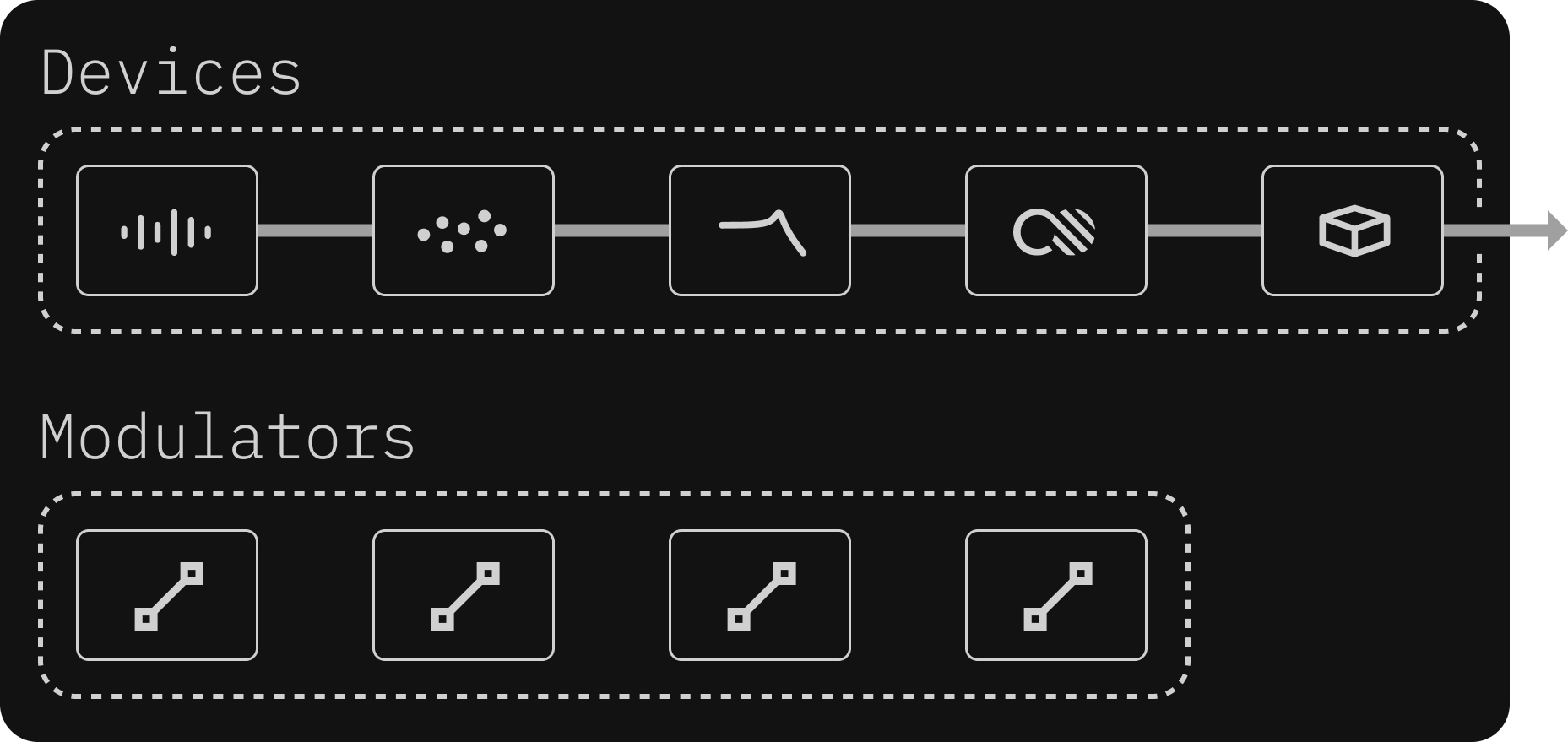 S-4は4つのステレオトラックを備え、各トラックには5つのデバイスをチェーン接続できます。また、各トラックには4つのモジュレーターが用意されており、同じトラック内の任意のデバイスパラメーターをモジュレーションするように割り当てることができます。