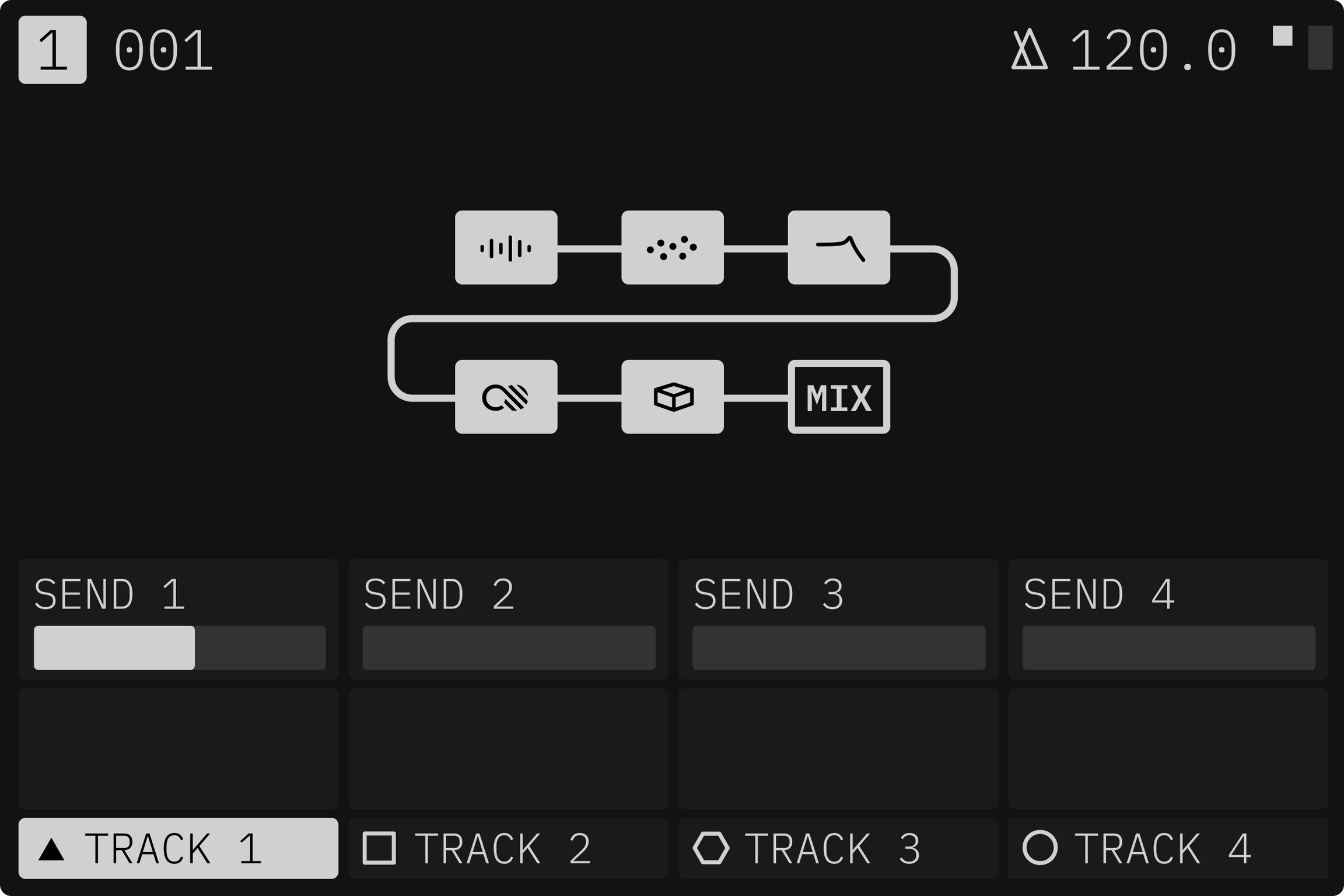 トラックビューは、S-4の4つのトラックの概要を表示します。このビューでは、トラックを選択し、センドを使用して他のトラックにルーティングできます。トラックビューのダイアグラムは、選択したトラック上のデバイスがアクティブかバイパスされているかを示します。